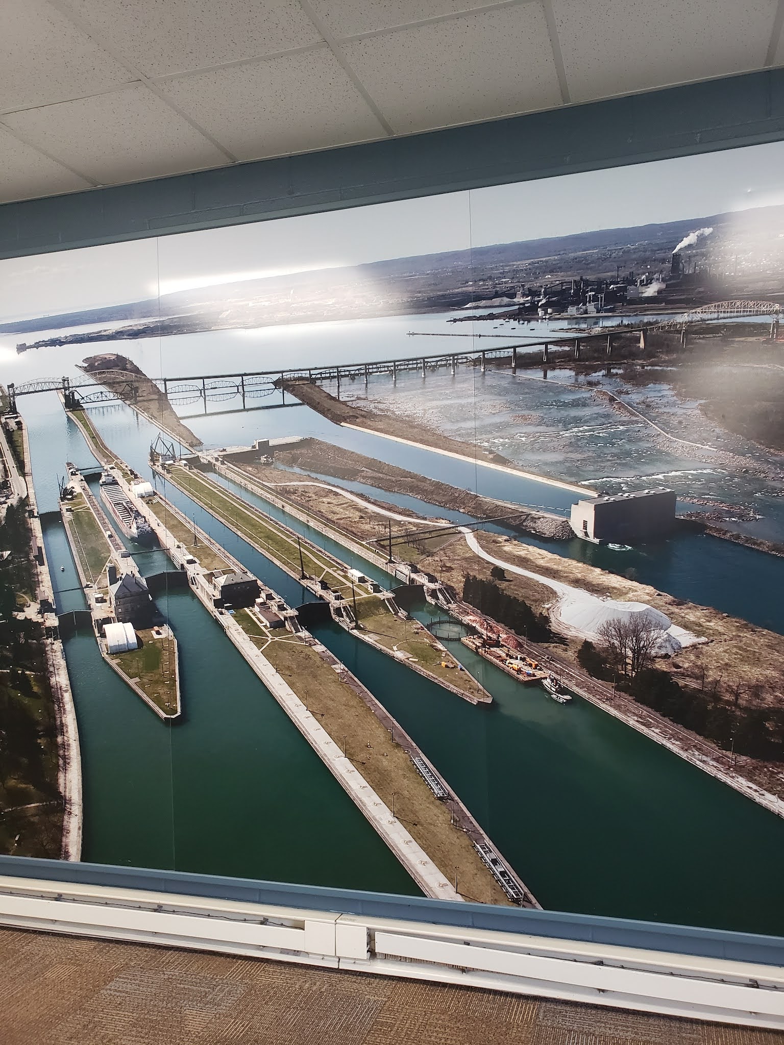 On Monday we took a drive up to Saulte St Marie to see the Soo Locks. The gravity fed locks are located between the USA and Canada and allow for vessels to travel from Duluth, MN to the Atlantic ocean. If you go to Marinetravel.com you can see where ships are traveling all over the world.